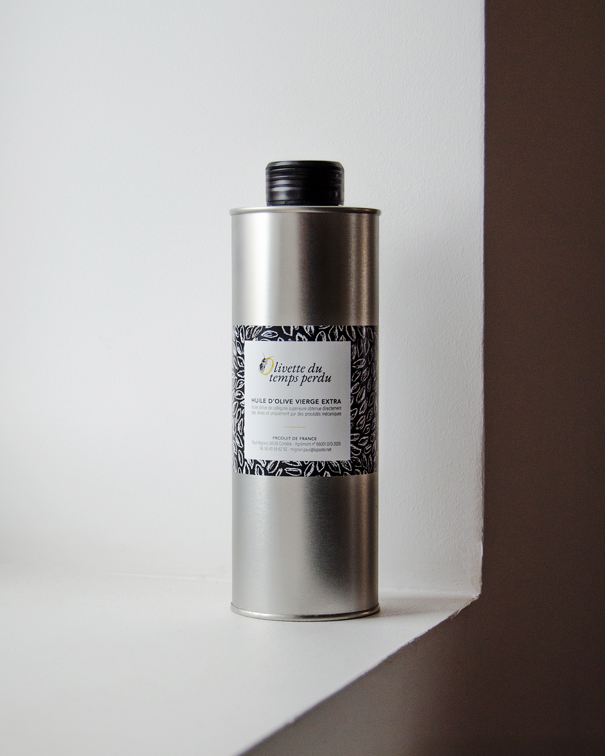 L’étiquette de l’huile d’olive “L’Olivette du temps perdu” raconte une histoire personnelle et universelle à la fois : celle d’une nature précieuse, habitée de signes et de résonances.